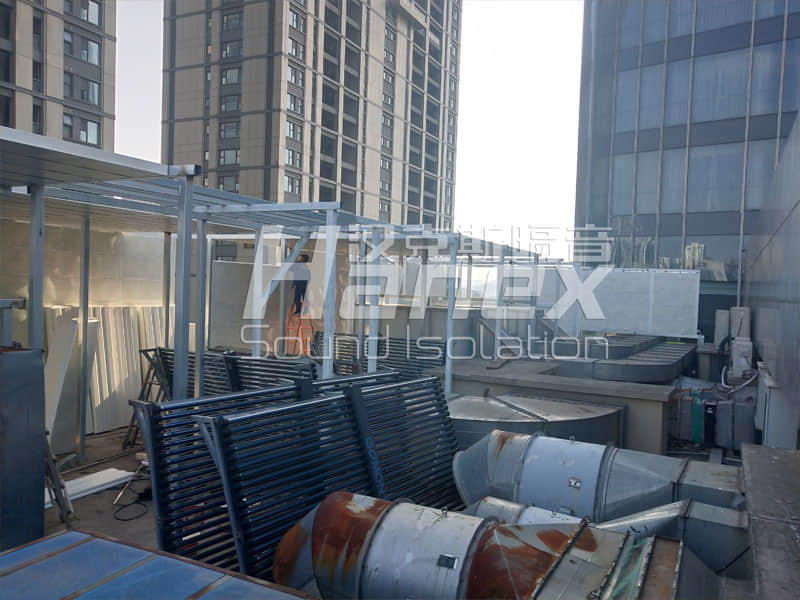 1、經(jīng)過(guò)漢克斯隔音技術(shù)人員現(xiàn)場(chǎng)踏勘及結(jié)合業(yè)主所提供的資料,屋頂上設(shè)計(jì)安裝半隔聲房降噪措施。
